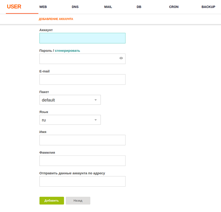 В разделе Users можно создать нового пользователя, а также назначить или убрать администратора. Выбрать «пакет» для пользователя. В данном случае пакет — это некоторые ограничения на хостинг, такие как количество сайтов, доменов, баз данных и т. д. Что-то вроде тарифных планов.