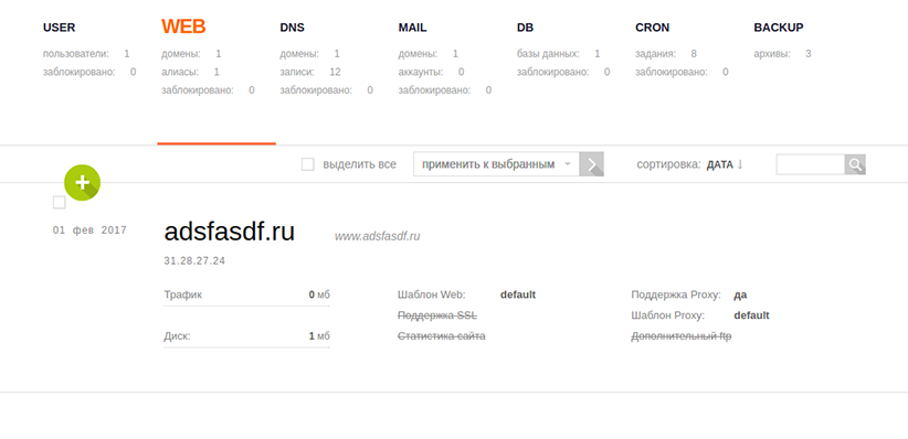 В разделе «WEB» добавляются новые сайты в систему. При добавлении нового сайта мы можем настроить SSL, FTP пользователя, подключить систему для сбора статистики сайта. Как мы уже писали выше, в систему интегрирован Letsencrypt, поэтому если у вас много сайтов на одном VPS и вам нужны бесплатные SSL, то вы подружитесь с этой панелью управления.