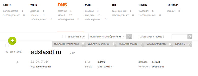 В разделе «DNS» настраиваются зоны DNS для домена.
