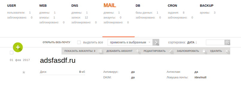 В разделе «MAIL» создаются почтовые ящики для сайтов. В качестве веб-интерфейса используется RoundCube. В зависимости от мощности сервера Vesta поставляется с ClamAV и SpamAssassin для защиты от спама.